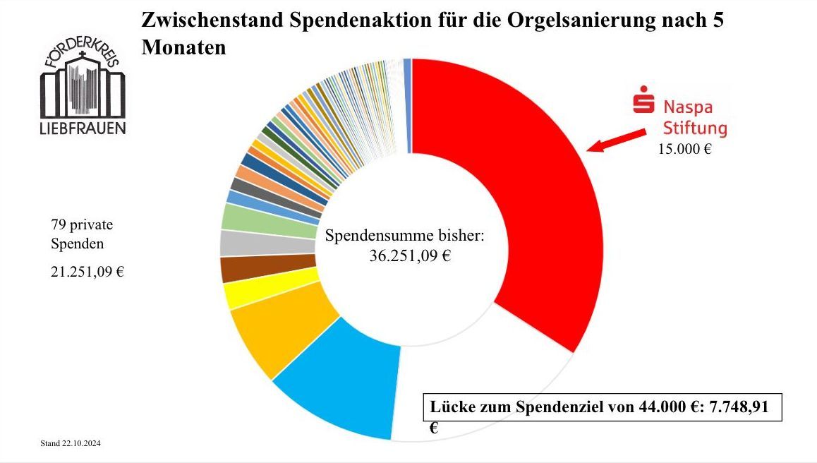 Pfingstmontag 2024, also vor gut einem Jahr, haben wir als Förderkreis Liebfrauen angekündigt, dass wir eine Spendenaktion zur Sanierung der Klais-Orgel in der Liebfrauenkirche starten. Als Förderkreis hatten wir uns vorgenommen 44.000 € beizutragen. Ein großer Teil davon, fast 40.000 € sind bereits auf unserem Förderkreiskonto zusammengekommen (siehe bunte Kreisgraphik). Wir hätten damals nicht erwartet, dass wir so schnell eine solch große Summe erreichen würden und sind sehr dankbar über die großzügigen und zahlreichen Spenden.